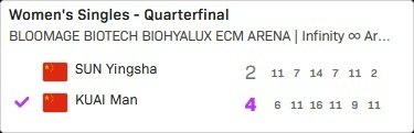 Sun Yingsha just lost to Kuai Man at the quarterfinals of WTT Champions Chongqing 2026 , this time without injury.